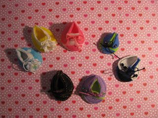 The little shoe bookmarks developed into mini shoes. These are the size of a cotton ball. They are embelished with flowers, beads and buttons. They even have little laces tied into bows. |